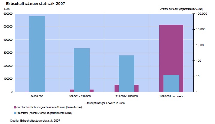 Nun zu den Zahlen Wallners und seinen Folgerungen selbst. Zunächst ist festzuhalten, dass Wallner in seinem Artikel von der Anzahl der Erbfälle in zwei Abstufungen, nämlich bei Erbfällen bis 219.000 Euro und jenen darüber, ableiten zu können meint, dass die von der ÖNB erhobene Verteilungswirkung nicht zutreffen könne. Doch dies mag zwar ideologisch vom Autor gewünscht sein, aber sachlich ist dies nicht nachvollziehbar. Auch dann nicht, wenn man die Zahlen durch die jene Angaben ergänzt, die einem Wallner auf Nachfrage zur Verfügung stellt: dass die Steuereinnahmen für alle Steuerfälle bis 219.000 Euro 86,6 Mrd. Euro ergeben, die aller Steuerfälle über 219.00 Euro nur 44,9 Mrd. Euro. Denn durch einen Vergleich von Äpfeln mit Birnen kann keine Aussage über die Quantitätsverhältnis unter den Äpfeln abgeleitet werden. Und genau dies tut Wallner, indem er von der Zahl der Fälle in zwei Gruppen auf die Verteilung der Erbschaftswerte zwischen den Erbenden schließt. Außerdem lässt sich Wallner auch bei einem peinlichen Fehler ertappen. Peter Mooslechner deckt nämlich folgenden Irrtum auf: „Wie eine kleine Nachrecherche überdies ergeben hat, dürfte Herrn Wallner ein nicht unrelevanter Datenirrtum unterlaufen sein. Tatsächlich unterstreichen die Daten der Erbschaftsteuerstatistik die Erhebungsergebnisse der OeNB: Von den insgesamt 67.853 von der Erbschaftssteuerstatistik erfassten Erbfällen (Immobilien und sonstige Erbschaften) des Jahres 2007 fallen rund 99,5 Prozent (67.625 Fälle) in die Klasse eines steuerpflichtigen Erwerbs von 219.000 Euro oder weniger. Lediglich rund ein halbes Prozent (228 Fälle) liegt über 219.000 Euro. Herr Wallner nennt in seinem Kommentar 487 Fälle oberhalb einer Grenze von 219.000 Euro. Dabei ist er offensichtlich eine Zeile abgerutscht, denn seine Fallzahl ergibt sich, wenn auch noch die Kategorie von 146.001 bis 219.000 Euro mit 259 Fällen hinzugerechnet wird.“ Die Zahlen, die auf Anfrage aus dem Finanzministerium geliefert werden, geben Mooslechner hier völlig recht. Wie nachfolgendes Balkendiagramm aus dem BMF (siehe Grafik unten) überdies zeigt, liegt eine noch stärkere Konzentration vor, als die Studie der Nationalbank ergibt, wenn man alle Erbschaftsformen berücksichtigt. Wird die durchschnittlich vorgeschriebene Steuer herangezogen, so zeigt sich, dass besonders die reichen Erben von Erbschaftssteuern betroffen sind. So lag die durchschnittlich vorgeschriebene Steuer bei jenen die weniger als 219.001 Euro erbten bei rund 1000 Euro, während jene darüber durchschnittlich rund 78.000 Euro vorgeschrieben bekamen. Jene, die 1.095.001 oder mehr an steuerpflichtigem Erwerb meldeten, waren mit Vorschreibungen von durchschnittlich mehr als einer halben Million Euro konfrontiert, was auf sehr hohe Erbsummen einiger weniger schließen lässt.